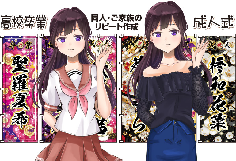人生にはいくつかの節目があります。学校の卒業、成人式は華々しい思い出の1シーンです。その喜びの日にのぼりを添えれば、さらに思い出深いものになります。中学、高校、大学と、卒業式も何度か経験するものですが、それぞれのぼりを作れば、ときどきそれらを並べて、楽しかったシーンに想いを馳せ、生きているしあわせを実感することでしょう。 |