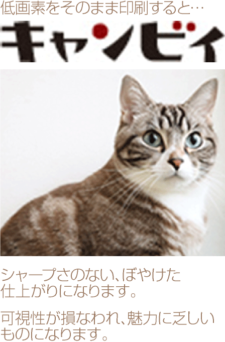| 画素数が十分でない原稿をそのまま印刷すると、シャープさがなく、ぼんやりした仕上がりになります。せっかく作ったのに魅力の乏しいビジュアルになってしまいます。画素数については、このページで詳しく説明しておりますので、ご依頼の前に、 |