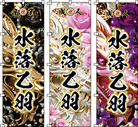 | ハレノヒのぼりでは、女性用のテンプレートもご用意いたしました。ピンク・ゴールドのロマンチックな色彩や、花柄・ハート柄のラブリーなアイテムをあしらった、かわいいのぼりデザインを取り揃えております。文字部分をお客様のお名前や指定の文字に差し替えます。各デザインの直下にあるデザイン番号でご注文下さい。このテンプレートの中で、気に入ったデザインがなく、自分の思い通りのデザインを0から作成したいという方は、オリジナルデザイン作成も承っております。 |